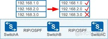 由于RIP是距离矢量路由协议,它是将自己的路由表通告给它的邻居路由器,当SwitchB的路由表中192.168.3.0/24这条路由被过滤以后,SwitchC也就无法再通过RIP学习到这条路由。也就是说,对于距离矢量路由协议,如果一台设备的路由表被进行了过滤,那么它会继续影响它下游的设备的路由表。