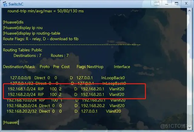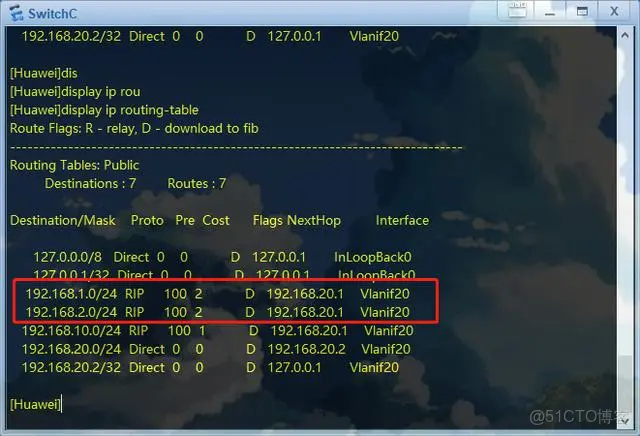 [SwitchB]rip [SwitchB-rip-1] filter-policy ip-prefix huawei export Vlanif20结果验证