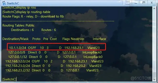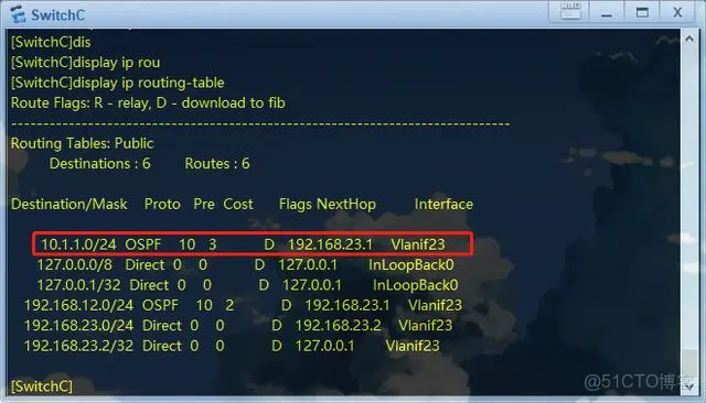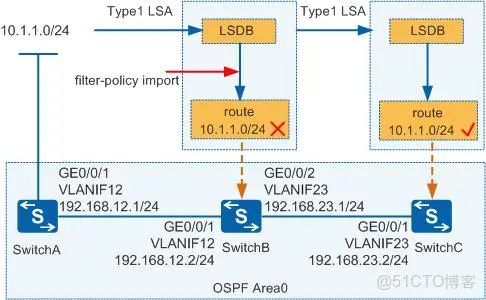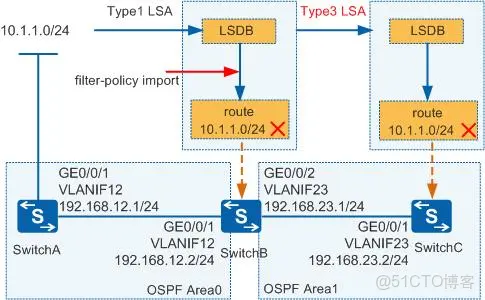 由于现在划分不同的区域,SwitchC上的10.1.1.0/24这条路由是由SwitchB根据自身学习的路由产生的Type3-LSA描述的,而SwitchB上的这条路由被过滤掉了,因此不能够再产生描述区域间路由的这个Type3-LSA,因此SwitchC上不会再学习到10.1.1.0/24这条路由。