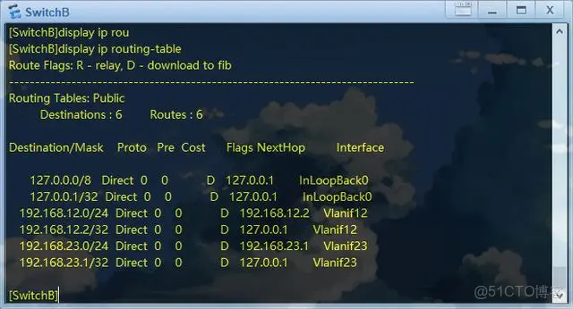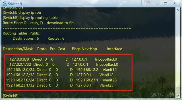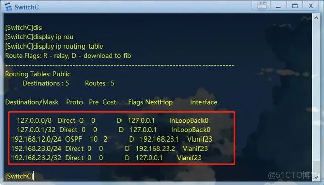 做完上述配置以后,查看SwitchB和SwitchC的路由表如下: