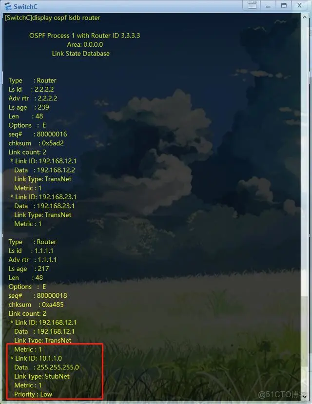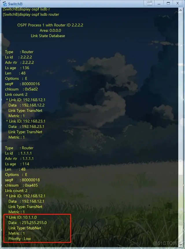 同时SwitchB和SwitchC的LSDB中仍然存在描述10.1.1.0/24这条路由的LSA信息,为了验证这一点,我们看一下SwitchB和SwitchC的LSA信息。