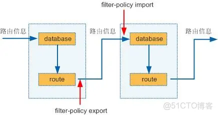 在距离矢量路由协议中,设备之间传递的是路由信息,如果需要对这种路由信息进行某种过滤,可以使用filter-policy实现,出方向和入方向的生效位置如下图所示。如果要过滤掉上游设备到下游设备的路由,只要在上游设备配filter-policy export或者在下游设备上配置filter-policy import就可以了。