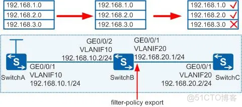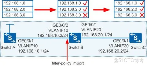 filter-policy也是一个很常用的路由信息过滤工具,如下图所示,SwitchA、SwitchB、SwitchC之间运行某种路由协议,路由在各个设备之间传递,当需要根据实际需求过滤某些路由信息的时候可以使用filter-policy实现。