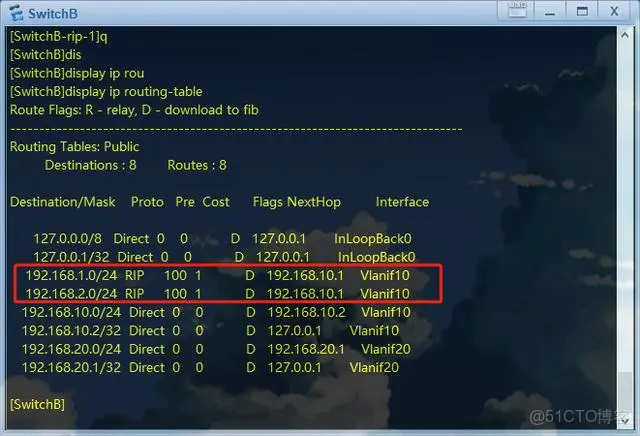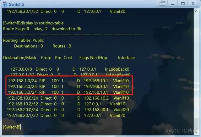 [SwitchB]rip [SwitchB-rip-1] filter-policy ip-prefix huawei import Vlanif10结果验证